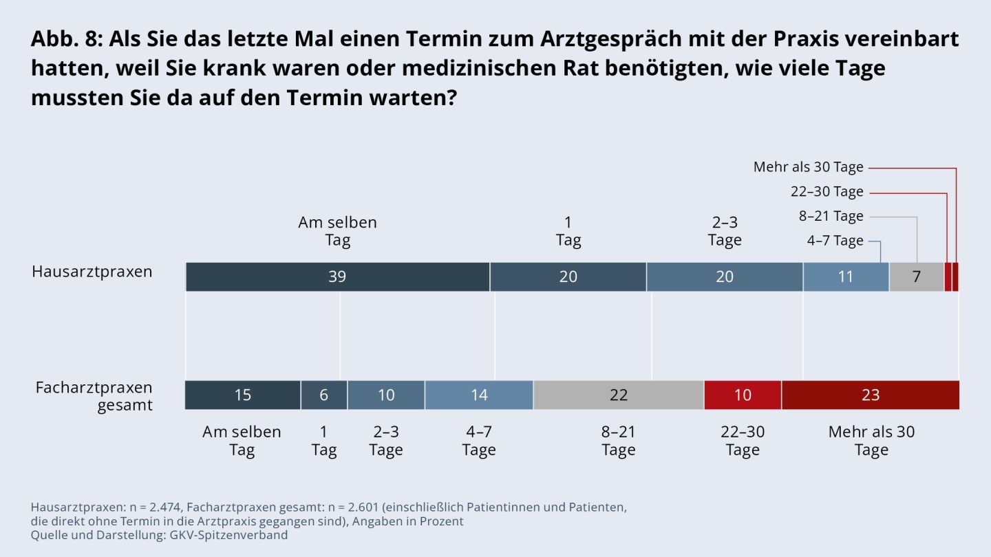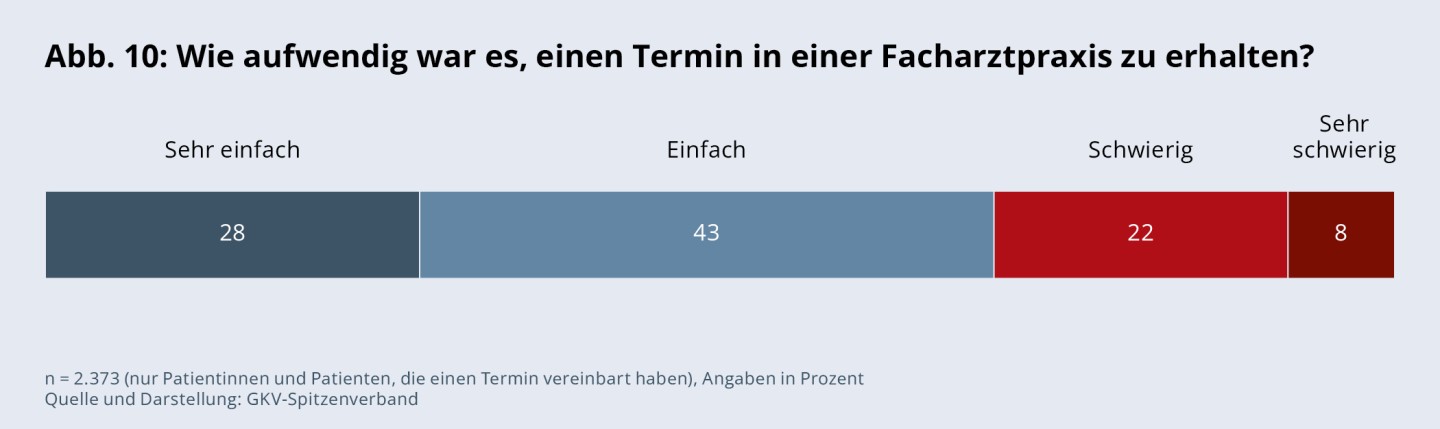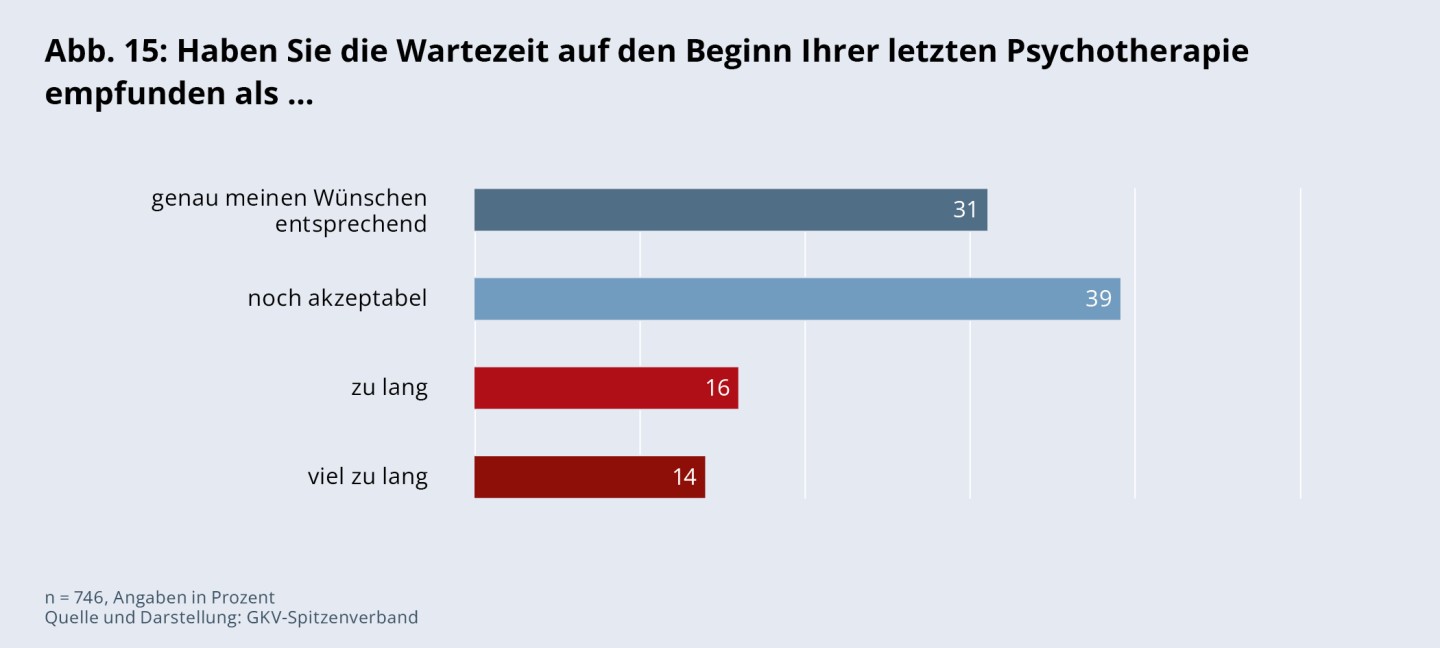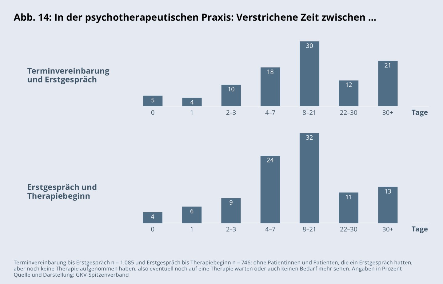 Diese Ergebnisse verdeutlichen zwar einen Handlungsbedarf, um den Zugang – insbesondere die Erreichbarkeit - zur psychotherapeutischen Versorgung zu verbessern, allerdings erhalten über 90 Prozent der Betroffenen mindestens einen Ersttermin. Um die Erreichbarkeit der Praxen weiter zu verbessern, fordert der GKV-Spitzenverband in seinem aktuellen Positionspapier (2025), dass eine angemessene Anzahl an Sprechstunden und die Hälfte der Behandlungsplätze über die Terminservicestellen der Kassenärztlichen Vereinigungen angeboten und vermittelt werden.[23]