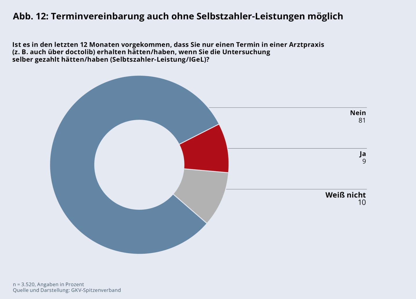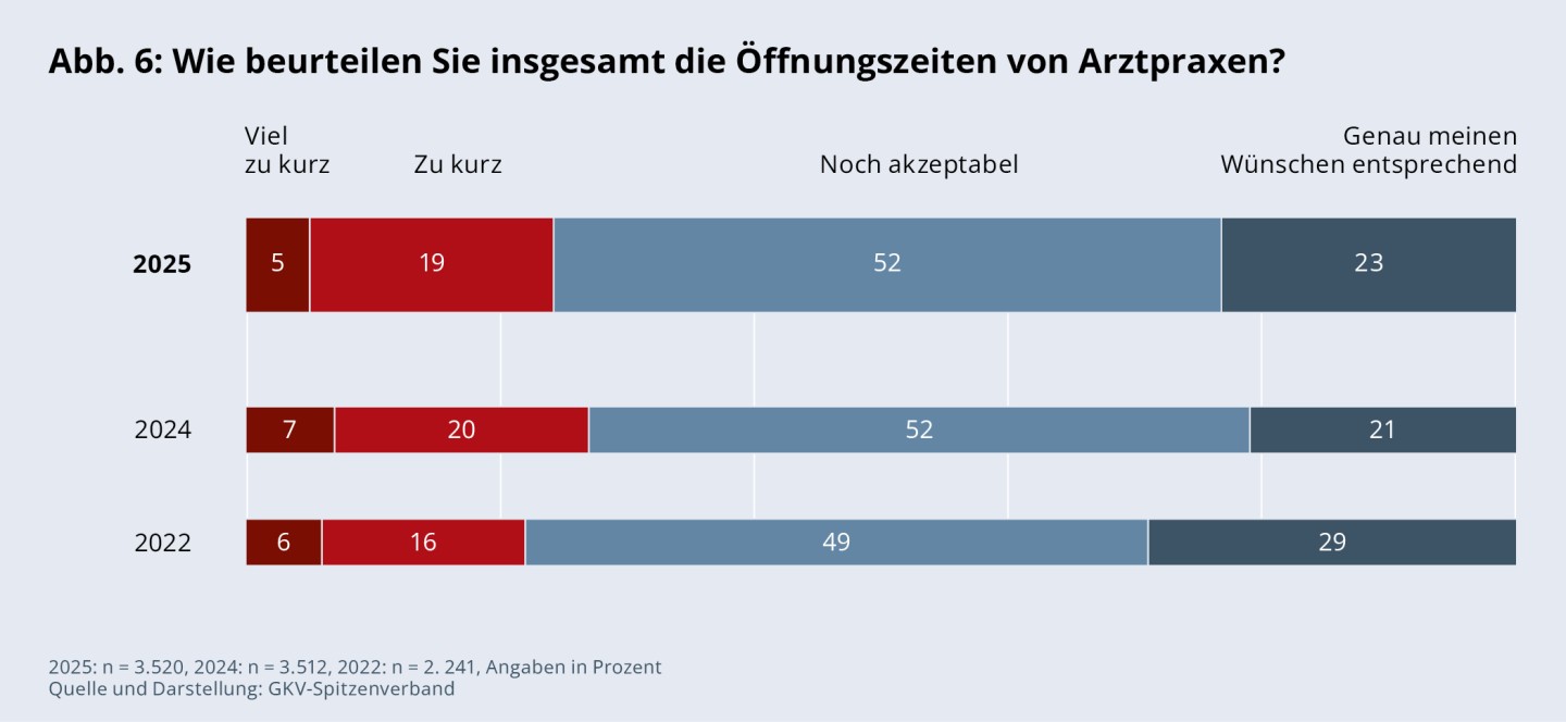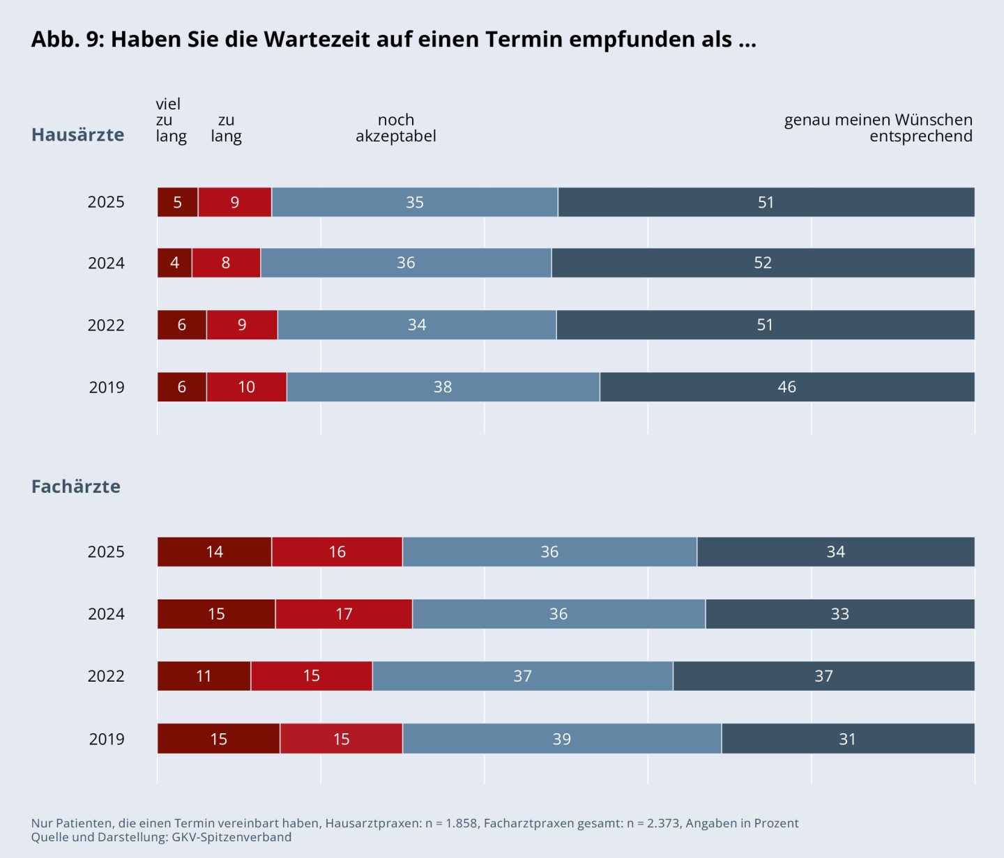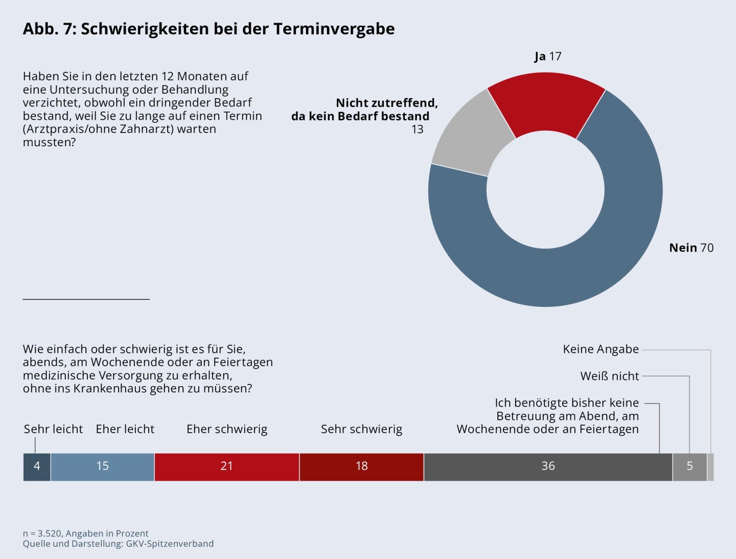 Diese Ergebnisse verdeutlichen zwar einen Handlungsbedarf, um den Zugang – insbesondere die Erreichbarkeit - zur psychotherapeutischen Versorgung zu verbessern, allerdings erhalten über 90 Prozent der Betroffenen mindestens einen Ersttermin. Um die Erreichbarkeit der Praxen weiter zu verbessern, fordert der GKV-Spitzenverband in seinem aktuellen Positionspapier (2025), dass eine angemessene Anzahl an Sprechstunden und die Hälfte der Behandlungsplätze über die Terminservicestellen der Kassenärztlichen Vereinigungen angeboten und vermittelt werden.[23]